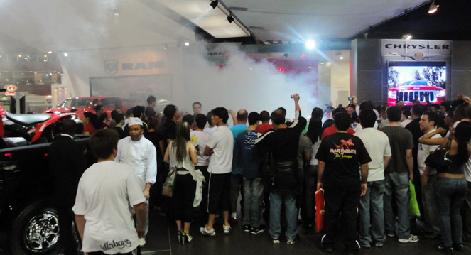 Um grupo agitava os braços, mas estava apenas seguindo ordens do mestre de cerimônias de um show promovido no estande da Volkswagen. Metros adiante, uma pequena multidão se aglomera em círculo: não estavam ouvindo de alguém o resultado do pleito, mas atentos à demonstração de vigor do Challenger SRT no espaço da Chrysler. Festa no ambiente da Chevrolet? Era só o convescote de alguns VIPs, felizes por poderem ver e tocar o pony car Camaro.